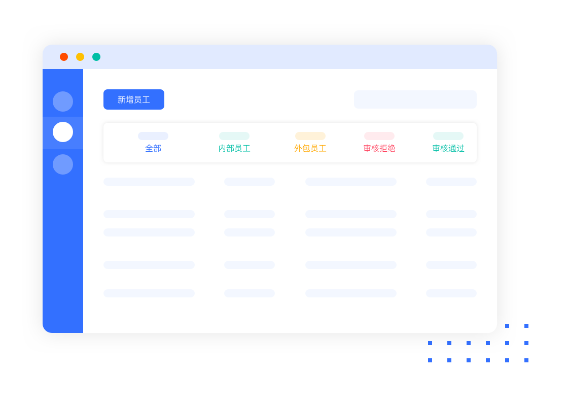 用工多样,员工类型分类清晰,规则单独管控,多种用工类型可并行,人员 可快速匹配,手机审批、内外部高效协同。用工申请、审批实时管理,同时 做到与劳务公司协同。