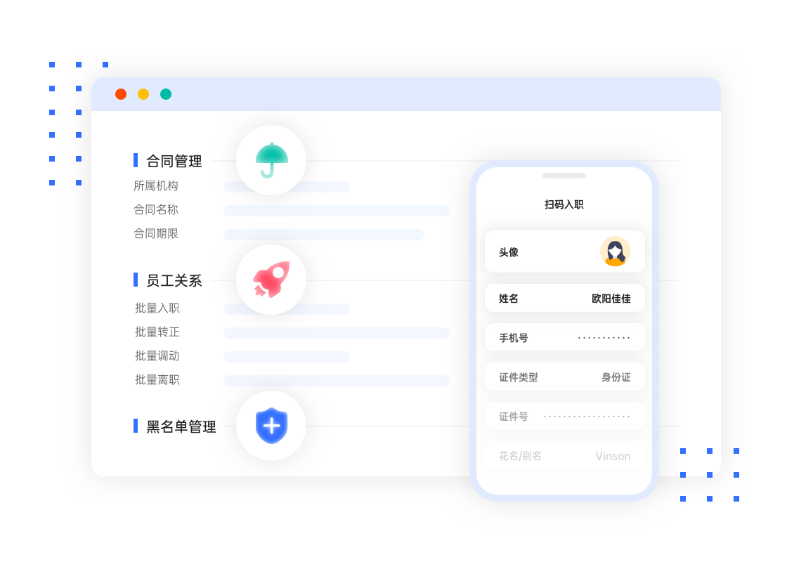 支持员工扫码入职,还有服务业的批量入职、转正、调动、离职,让入、转、调、离更高效。黑名单管控、合同管理等显著降低用工风险。